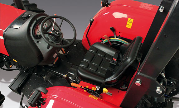 CONDUCCIÓN El puesto de conducción sobre plataforma es amplio y confortable y cuenta con un asiento regulable en varias posiciones. La dirección hidrostática y las palancas de cambio colocadas de forma ergonómica y racional al lado del conductor maximizan el confort de marcha. El bastidor de seguridad de dos montantes puede equiparse de un techo parasol.