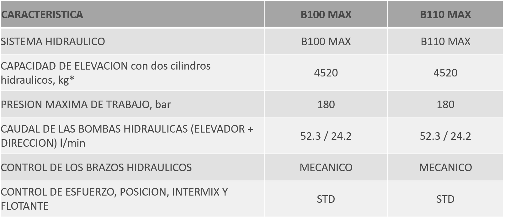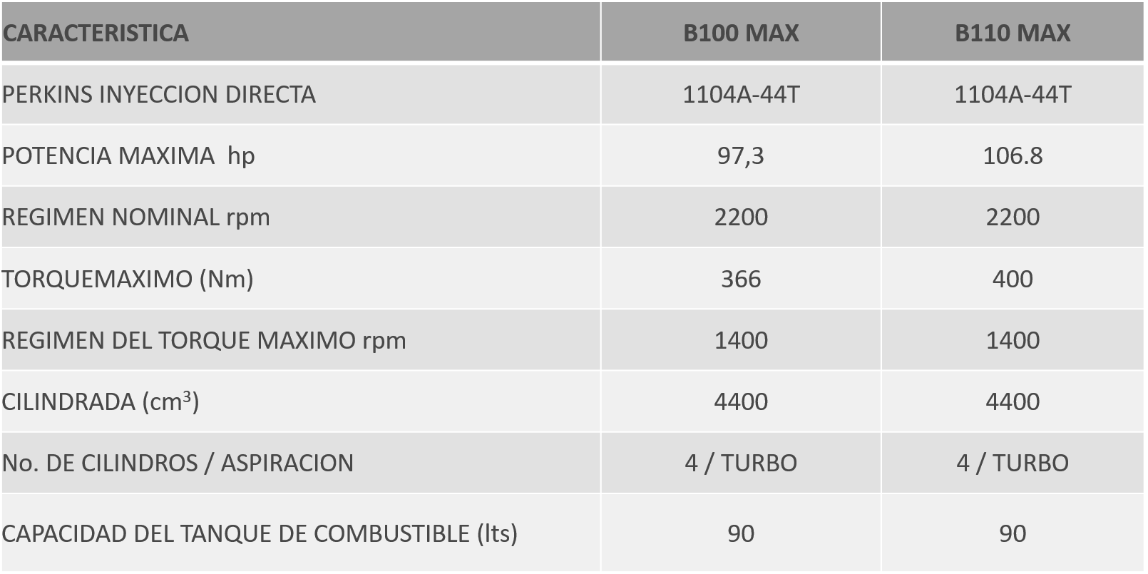 Los nuevos modelos B100 MAX está disponible en versiones de dos o cuatro ruedas motrices; y solo en version de cuatro ruedas motrices para el B110 MAX. Equipados con un motor Perkins Inglés de cuatro cilindros turbocargado, el motor ofrece prestaciones máximas para un tractor de su categoría, conjuga soluciones de máxima simplicidad técnica con el máximo rendimiento en terminos de potencia, torque, reserva de torque y consumo de combustible. Equipado con un bloqueo del diferencia tipo Heavy Duty, reforzado de 4 planetarios, posibilita su uso bajo las condiciones más severas de trabajo. Su nuevo diseño de palancas laterales, escape vertical lateral, semiplataforma con piso recubierto con tapete de caucho, nuevo diseño de cofre con faros integrados, facilitran su operación y lo hace más cómodo y productivo