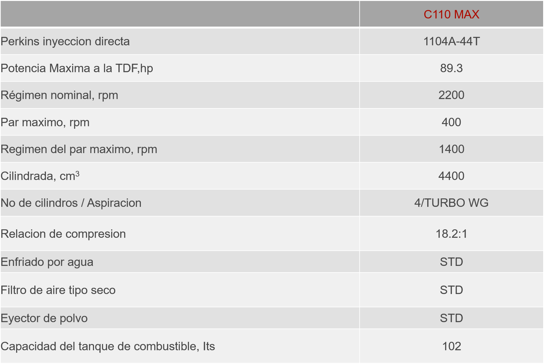 El tractor McCormick C110 max, en versión con plataforma o cabina amortiguada sobre silent blocks, viene a México a revolucionar la linea de tractores de gama media. Con las características de la línea McCormick el C110 max cuenta con 106.8 hp. Ofrecen todas las características esenciales de los tractores de esta clase, con un diseño más simple y unos costos más reducidos con respecto a la Serie “CX”. Equipada con los nuevos motores Perkins Serie 1104A-44T, que complementan la robusta construcción del tractor, la gama McCormick “C-Max” proporciona prestaciones excelentes asociadas a una fiabilidad inigualable. Las características más notables de esta gama de tractores son una transmisión mecánica con inversor, un circuito hidráulico potente para el accionamiento de un elevador mecánico de alta capacidad de elevación y un bloqueo total de los diferenciales traseros y delanteros.